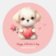 Un autocollant de la Saint Valentin avec un mignon chien tenant un coeur rouge sur un arrière - plan rose. Le texte dit, "Heureuse Sainte-Valentin". Personnalisez avec votre nom en bas. Parfait pour sceller les enveloppes ou traiter les sacs.