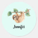 Stickers avec un adorable paresseux accroché à l'envers d'une branche d'arbre. La branche d'arbre est décorée de feuilles tropicaux et de baies. Placez-vous sur un arrière - plan vert clair.
