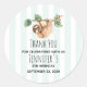 Anniversaire ou autre événement merci autocollants avec une adorable paresse accrochée à l'envers d'une branche d'arbre. La branche d'arbre est décorée de feuilles tropicaux et de baies. Placé sur un arrière - plan rayé vert clair et blanc.