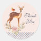 sticker Merci avec une belle doe brune avec taches blanches sur sa fourrure. Un oiseau mignon assis sur le dos du cerf. Un élégant arrangement floral composé de roses d'aquarelle et de feuilles vert clair sous ses pieds. Une bordure en pois bleu avec un arrière - plan de couleur pêche le long du fond. Design chéri et adorable.