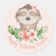 Un sticker rond tendance pour Anniversaire heureux avec paresse mignonne pour les petites et grandes filles accentué de pêche et de couleurs roses sur un arrière - plan rose vif. Personnaliser avec nom et âge (facultatif)