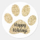 Ce étiquette autocollant mignon pour les amoureux des animaux de compagnie présente un empreinte de patte parties scintillant en faux or avec les mots Happy Holidays à l'intérieur sur un arrière - plan blanc. Parfait pour vos cadeaux de Noël et de Fêtes.