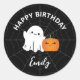 Joyeux Anniversaire Halloween Kids Party Classic Round Sticker avec le fantôme, citrouille, et toile d'araignée. Personnalisez-le avec vos informations ou éditez-le plus loin pour la couleur de police ou la taille dans l'outil de conception.