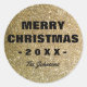 Autocollants ronds de parties scintillant parkly avec texte "Joyeux Noël" en gras, y compris le nom de l'année et le nom personnalisé.