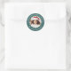 Des autocollants ronds et verts de pin avec le texte personnalisable "Je vous souhaite un joyeux Noël" et votre nom autour de votre photo à l'intérieur d'une bordure ondulée.