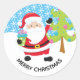 L'autocollant de Noël fantaisiste présente le Père Noël portant un cadeau et vous saluant d'un arrière - plan enneigé. Le texte, sur le bas de l'autocollant, "Joyeux Noël" peut être personnalisé. Ces autocollants sont parfaits pour les paquets et les enveloppes de cartes de Noël.