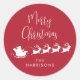 Un autocollant rouge et blanc saisonnier amusant pour vos cartes de fin de année de Noël et des cadeaux avec une silhouette de rennes volant Père Noël traîne à travers l'air, "Joyeux Noël" dans un script moderne et votre nom dans une simple typographie.