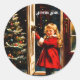 Sticker rond classique avec un design graphique de Noël d'inspiration vintage. Une petite fille mignonne en manteau rouge se tient au seuil de la porte. Elle sourit.La nuit étoilée en plein air contraste magnifiquement avec le sapin de Noël festif dans le hall. Il est livré avec le voeu de Noël français " Joyeux Noel ". Grâce aux outils polyvalents Zazzle, vous pouvez customiser facilement du texte et des polices. __________________ Design réalisé en collaboration avec Canva AI et Alma Wad le concepteur humain.