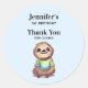 Des autocollants de remerciement de fête avec une adorable illustration montrant un paresseux joyeux vêtu d'un t-shirt vert. Assis à pattes croisées dans une pose de méditation détendue.