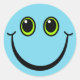 Ces autocollants de visage d'émoticônes bleues ont un grand sourire heureux et des yeux verts.