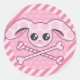 Caricature kawaii mignonne d'un crâne à pois rose lapin lapin ceint et os croisés avec de gros yeux de googly anime et des os de croix de coeur rayés sucre de canne rose.