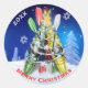 Ces autocollants festifs de Noël kayak comportent un kayak vert, jaune et rouge et des pagaies propulsées à la fin dans un banc de neige lors d'une soirée d'hiver enneigée, décorées et emballées dans une guirlande pour imiter un arbre de Noël - personnaliser avec votre salutation de vacances - Tous droits réservés. © katz d zynes