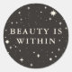 Cet autocollant présente un design céleste avec un texte qui dit "La beauté est à l'intérieur" entouré d'étoiles mystiques. Ce serait parfait pour l'utilisation comme emballage décoratif pour n'importe quel produit avec un thème de tarot ou céleste ou pour une fête de faveurs avec un thème de beauté ou de maquillage.