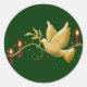 Un dessin d'une colombe dorée de paix volant avec ses ailes arrosées vers le haut, portant une branche d'olivier dans son bec. Il vole à travers un délicat tourbillon horizontal orné d'or qui comporte de minuscules flocons de neige qui tombent autour d'elle et trois bougies rouges qui brûlent de façon éclatante.