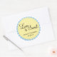 Personnalisez avec les noms et la date. Cet autocollant bleu clair et jaune à la lisière peut être utilisé pour votre table de buffet de bonbons mariages pour ballotins, ou sacs, les sacs de cadeaux invités et bien plus encore! Parfait pour ce boulanger aussi! s'il vous plaît envoyez-moi un courriel à paula@labellarue.com si vous avez besoin d'un changement de couleur.