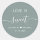 Chic sticker vert sauge pour vos bonbons mariages met en vedette "l'amour est doux" en lettres blanches propres et un élégant script blanc avec des swashes, vos prénoms unis par un coeur et votre date mariage.