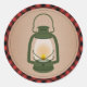 Un autocollant avec l'illustration d'une lanterne de camping verte. Arrière - plan est un stock de carte inspiré du rouge et du noir plaid.