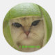 Un gentil petit chat mignon portant un cantaloupe sur la tête.