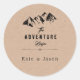 Personnalisez cet autocollant rond "L'aventure commence" et modifiez le nom, la date, la police ou la couleur du papier pour le rendre unique. Ce design a une belle ambiance vintage avec un choix soigneux de polices et d'illustrations