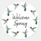 Joli autocollants "Welcome Spring" avec colibris à gorge rubis sur un arrière - plan blanc. Le colibri à gorge rubis (Archilochus colubris) est un tout petit oiseau au dos vert émeraude, masque noir, couronne verte et gorge rouge vif. On le trouve dans les forêts ouvertes, les bords des forêts, les prairies, les prairies, les parcs, les jardins et les jardins près des mangeoires et des fleurs en forme de tube.