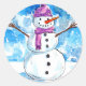 aquarelle colorée et dessin à l'encre d'un bonhomme de neige avec casquette violet et écharpe debout sur un champ couvert de neige sous un ciel bleu nuageux sur un autocollant