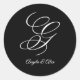 Créez votre propre autocollant monogramme "lettre G" ou "initial G". Les couleurs noir et blanc sont personnalisables pour correspondre à votre palette de mariages. Supprimez les prénoms du couple si vous le souhaitez. Ajoutez une date de l'anniversaire du mariage. Si vous supprimez le texte personnalisé, vous pouvez centrer l'image monographique. Image créée avec une version moderne d'un style classique de calligraphie à la main.