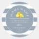 Le limoncello chic moderne favorise les autocollants. Caractéristiques de design, citrons et feuilles aquarellés, lignes de texte motif arrière - plan et modèle bleu et blanc poussiéreux pour votre nom et la date de l'événement.