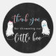 Le thème d'Halloween le genre révèle la fête avec l'illustration d'une fille et des fantômes de garçon. Le texte dit "merci d'avoir pris notre petit boo."