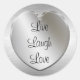 Ces trois mots célèbres : "Live, Laugh, Love" en écriture élégante sur un coeur 3d métal argenté lisse qui est sur une texture arrière - plan chromée en métal brossé. Personnalisez facilement cet autocollant en modifiant le texte, ou supprimez ce modèle arrière - plan avec votre propre photo ou image. Inspirationnel, et un grand dicton pour vivre. Nice pour les mariages, 25ème anniversaire d'argent, Saint-Valentin, fête d'anniversaire, etc.