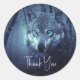 Des autocollants de Merci, avec l'image d'un loup mystique magique debout dans une forêt avec une légère chute de neige autour. C'est des yeux bleus qui attirent vraiment votre attention.