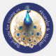Un beau paon royal 5D (5 dimensions) avec une plume de poitrine bleu foncé et un faux or et une plume de queue bleue. Sa couronne est en haut et il vous regarde côte à côte. Cet oiseau élégant est dressé contre un cercle blanc rond bordé d'une fausse bordure dorée et bleu foncé sur laquelle des modèles blancs pour votre libellé personnalisé apparaissent. L'oiseau semble sortir de l'autocollant adhésif / étiquette et est idéal pour les cadeaux de faveur de mariage, douches nuptiales, anniversaires mariages et tout événement ou fonction qui a un thème paon.