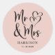 Un autocollant rose vif chic pour votre correspondance mariage et vos faveurs de parti avec "Mr & Mrs" écrit dans un grand script et une illustration de deux coeurs réunis. Ajoutez votre nom et votre date de mariage.