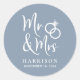 Des autocollants bleus poussiéreux personnalisés pour votre correspondance mariage et des faveurs avec "M. & Mme" écrit dans un grand script blanc et une illustration blanche de deux anneaux mariages réunis. Ajoutez votre nom et votre date de mariage.