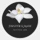 Blancs Magnolia Elégant Mariage Noir et Blanc Classic Round Sticker conçu avec une fleur de magnolia blanc brillant sur un arrière - plan noir avec texte blanc. Le texte comprend : Les prénoms et la date du Mariage de la mariée et de la mariée. Pour personnaliser, insérez simplement vos détails dans notre modèle facile, en remplaçant l'exemple de texte. N'oubliez pas de consulter la collection complète White Magnolia Elegant Wedding Black and White pour les cartes et accessoires correspondants.