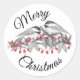 L'autocollant présente l'illustration originale d'une paire d'oiseaux chiches sur une branche de pin, entourée de neige, de pinecones et d'un brin de lumières rouges de Noël.