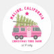 Illustration d'un RV rose avec sapin de Noël attaché au sommet. Texte dit, "Malibu California Christmas Tree Farm Cut & Carry"