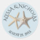 Un autocollant rustique de mariage de plage avec les noms de mariée et de mariée et la date mariage. Autocollant bleu clair avec texte courbe et étoile de mer.