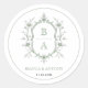 Élégant sauge vert vintage crête florale monogramme mariage rond autocollants. Ces stickers ronds charmants, avec un élégant monogramme vert sauge à crête florale, offrent une façon délicieuse de personnaliser vos faveurs de mariage, papeterie, ou même sceller vos enveloppes. Chaque autocollant présente les initiales du couple, astucieusement placées dans une crête fleurie d'inspiration vintage rendue dans une belle ombre de vert. Sous cet élégant monogramme, les noms du couple heureux sont affichés, accompagnés de la date significative de leur mariage. Pour compléter le design, une bordure verte à la sauge fine et délicate encadre gracieusement l'autocollant, fournissant une touche polie et sophistiquée. Modifiez