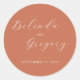 Une belle conception mettant en valeur la typographie de calligraphie de script élégante sur un arrière - plan orange brûlé en terre cuite. Parfait pour tous ceux qui aiment les conceptions minimalistes modernes. Un design élégant et tendance autocollant mariage avec des éléments classiques. Des invitations de mariage et d'autres articles de papeterie sont également disponibles.