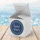 Autocollant élégant pour mariage en forme ronde avec thème nautique, avec une bordure à rayures blanches et le mot "mariage" en écriture cursive tendance sur fond bleu. Utilisez-le pour sceller vos enveloppes. Découvrez d'autres articles de mariage ici https://www.zazzle.com/rosewoodandcitrus/gifts?cg=196540141241316965&rf=238364477188679314