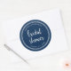 Autocollant élégant pour mariage en forme de cercle et à thème marin, avec une bordure à rayures blanches et le mot "mariage" en lettrage à la brosse tendance sur fond bleu. Utilisez-le pour sceller vos enveloppes. Découvrez d'autres articles de mariage ici https://www.zazzle.com/rosewoodandcitrus/gifts?cg=196540141241316965&rf=238364477188679314