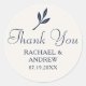 Merci pour les autocollants de mariage personnalisés avec les noms des mariés et la date de la cérémonie. Un modèle rond élégant, avec une police serif traditionnelle, une écriture calligraphique vintage et un motif de branche de feuilles. Parfait pour les mariages, les enterrements de vie de jeune fille et les anniversaires de mariage — une touche finale élégante pour votre papeterie de mariage, pour sceller les enveloppes ou attacher des rubans, des cartes et des étiquettes aux cadeaux de fête. Vous pouvez également personnaliser la couleur de fond à l'aide de l'outil d'édition de conception. Couleurs imprimées : bleu marine très foncé et crème ivoire blanc cassé. Découvrez la collection pour assortir la papeterie et les fournitures en vente en ligne !