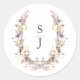 Autocollant rond fleur sauvage violet mariage classique. Facile à modifier le texte. Joli monogramme aquarelle floral.