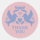 Scellez vos remerciements de mariage avec une touche de romance en utilisant cet autocollant rond classique de la collection "Mariage Oiseaux Amour". Un fond rose tendre met en scène un charmant duo d'oiseaux d'amour, liés par un ruban affectueux, symbolisant le lien d'amour et de gratitude. Cet autocollant, prêt à être personnalisé, est idéal pour ajouter une touche finale à vos cadeaux et notes de mariage.