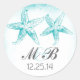 Tropical starfish couple bleu plage autocollants de mariage sceaux avec votre monogramme et date mariage, peut être utilisé sur vos faveurs ou sur le côté arrière des enveloppes.