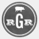 Les joints d'autocollants ronds sont munis d'un monogramme d'initiales de nom et d'un dessin de rôti de porc avec un motif de porc. Cartes blanches en monogramme sur un arrière - plan à la texture rustique noir.