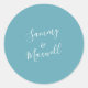 Ces autocollants de mariage présentent le nom de la mariée et du marié dans une police de caractères manuscrite moderne sur une solide couleur bleu turquoise. Utilisez-les pour les sceaux d'enveloppe mariages ou les faveurs de fête. Pour voir les articles correspondants de Victoria Grigaliunas visitez DoTellABelle sur Zazzle à www.zazzle.com/dotellabelle