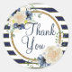 Merci aux clients ou aux invités avec cet autocollant bleu marine, blanc et doré magnifiquement élégant et classe. Il présente un bleu marine époustouflant avec des rayures blanches arrière - plan, agrémenté d'étonnantes compositions florales bleues et blanches. Idéal pour un baby shower nautique, baby shower fleuri, à attacher à des paquets ou à des sacs de bonne qualité.