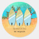 3 rennes de nez rouge se cachent derrière leurs planches de surf dans cette jolie scène de Noël côtière. Le message personnel est facilement customisé ou supprimé.