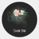 Un autocollant de remerciement avec l'illustration de quelques délicates fleurs roses en fleurs avec des tourbillons verts et des feuilles sur un arrière - plan noir avec un peu de gris clair autour des fleurs pour accentuer et illuminer. Merci écrit dans une police art déco rose clair.